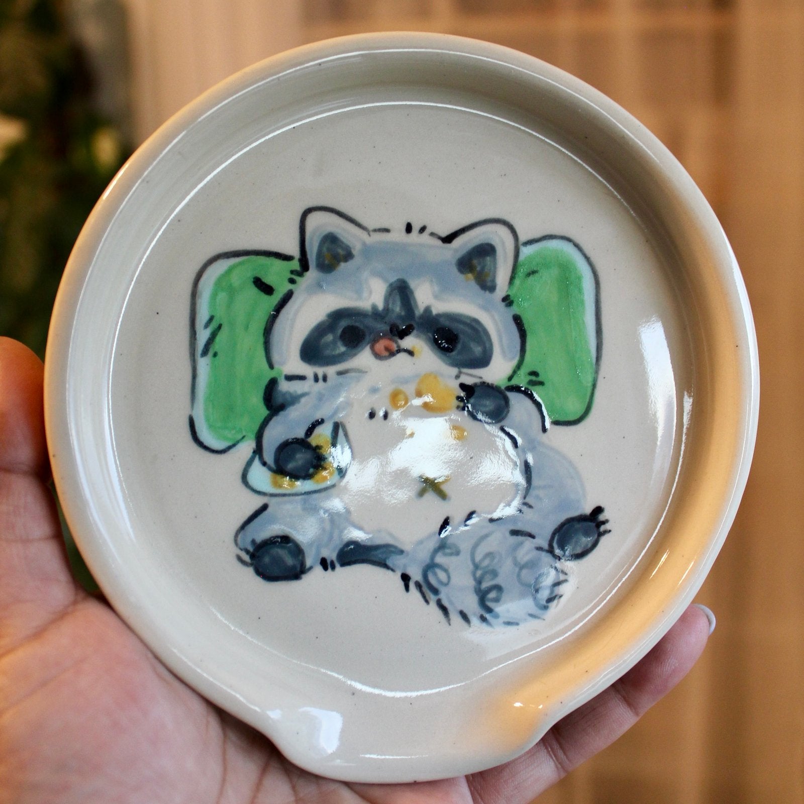 The spirit of lazy Sundays captured in clay. This handmade spoon rest features a raccoon sprawled across a pillow, chips tumbling everywhere — the true mascot of “I’ll do it later.” Perfect for cooks who snack mid-recipe or anyone who believes rest is a valid ingredient.