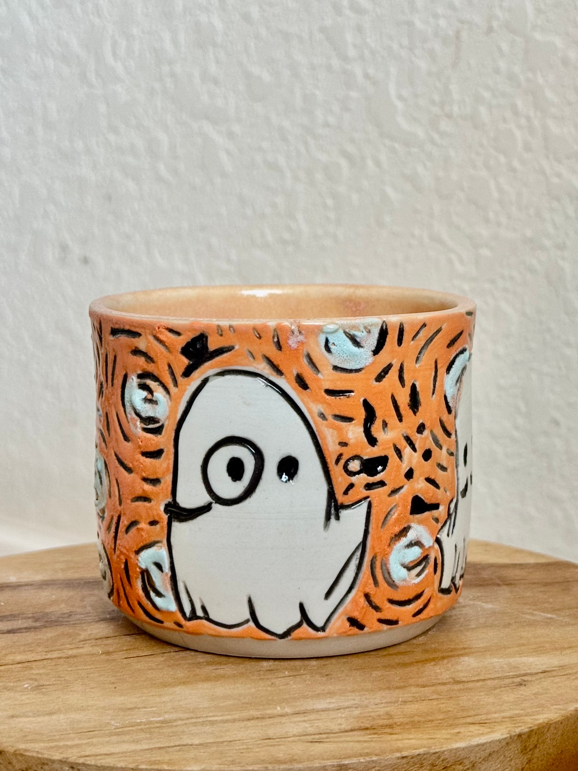 <li><strong>Orange Fancy Ghost Cup:</strong> ~6 oz, featuring dapper ghost personalities — mustaches, pipes, and monocles — perfect for espresso or tea.</li>