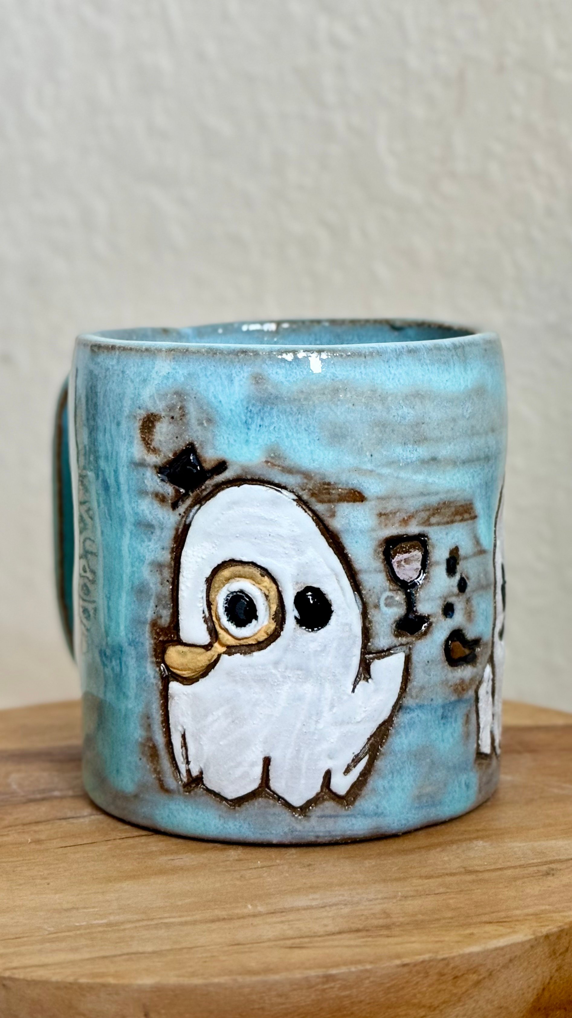 <li><strong>Blue Fancy Ghost Mug:</strong> ~10 oz, starring monocled and mustached ghosts with top hats. The most distinguished spirits you’ll ever sip with.</li>